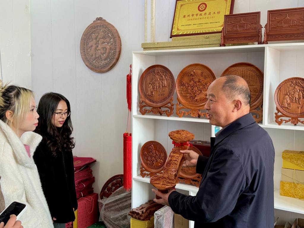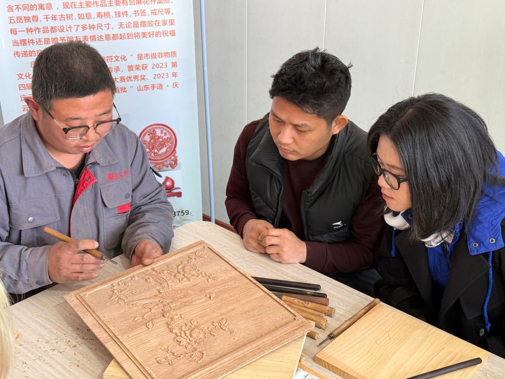 在庆云镇张桃符村,留学生参观了各类桃符雕刻作品。通过省级非遗传承人的讲解,同学们深入了解了中国传统民俗中“祈福纳祥”的文化内涵。在手工匠人的指导下,留学生们亲自拿起了刻刀,学习桃符雕刻技艺。从刀具选择到握刀姿势,从图形描画到细节勾勒,通过沉浸式体验,同学们切实体会到,非遗传承不仅是技艺的延续,更是“一生择一事”的精神传承。