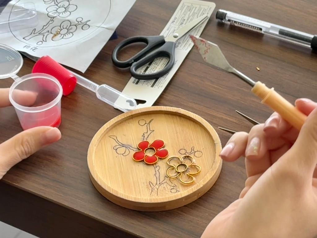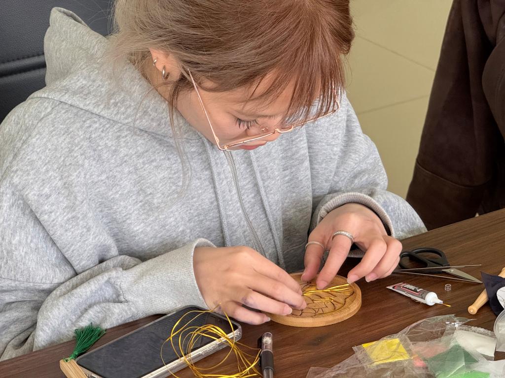 本次活动的最后一个环节是掐丝珐琅工艺体验,留学生们以铜丝为笔、釉料为墨,在木胚上创作出了各式各样的杯垫作品。同学们发现,这样的技艺不仅体现了个人的审美能力和动手能力,更考验了大家的耐心和韧劲。