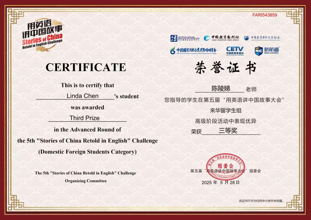 2025年5月30日,我校来自印度尼西亚的刘仙静同学在第五届“用英语讲好中国故事”大会来华留学生组高级阶段活动中表现优异,荣获省级三等奖。此次比赛由中外语言交流合作中心、中国教育报刊社等单位指导,中国国家创新与发展战略研究会、中国教育电视台等机构联合主办,旨在推动中华文化国际传播,展现新时代中国形象。刘仙静同学在陈陵娣老师的悉心指导下,凭借出色的英语表达能力和对中国文化的深刻理解,在线上决赛中脱颖而出,最终斩获佳绩。
