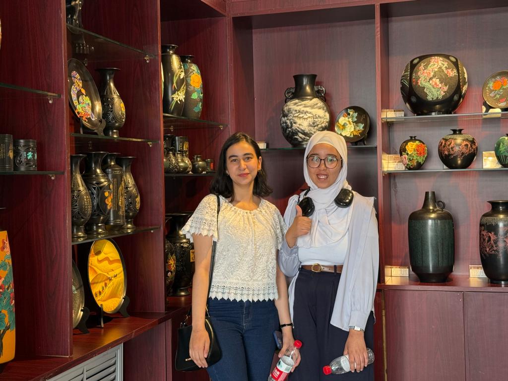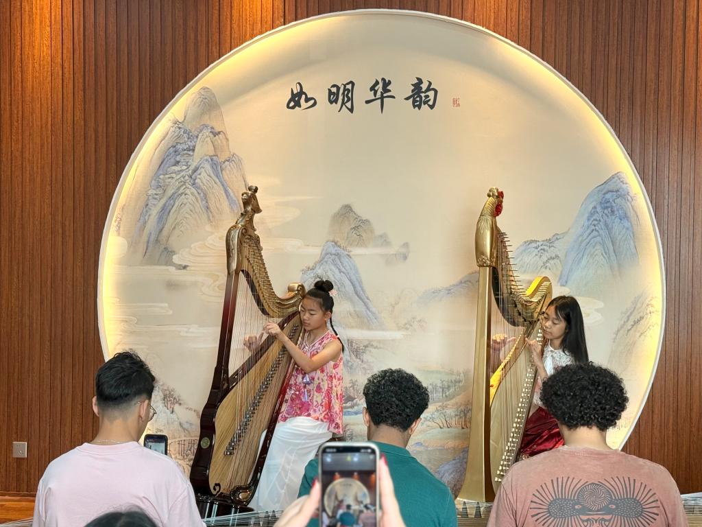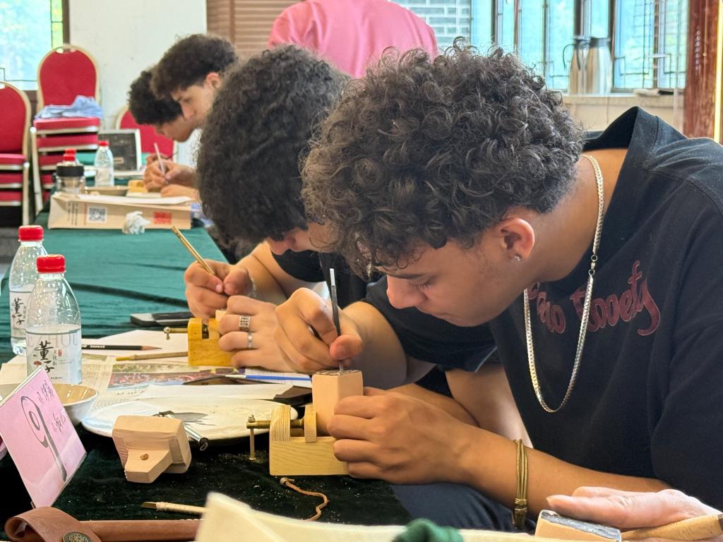 留学生们沿着精心设计的路线依次参观了木刻刀笔书画、陶瓷印章制作、刻瓷技艺、金丝彩贴、彩贴绣、玉雕等传统技艺展示。在与各位技艺传承人的亲切交流中,同学们深刻感受到了中华传统手工技艺精雕细琢的独特魅力以及精益求精的工匠精神。同时,传统手工艺和现代艺术的创新融合,也让同学们看到了非遗技艺在当代焕发的新生与活力。此外,同学们还欣赏了源自中国的古老弹拨乐器--箜篌的现场表演,空灵浑厚的音色让同学们深陷其中。通过解说老师的介绍,同学们进一步了解到,这一历史悠久、造型独特的传统乐器流传至各个国家,成为中外文化交流的重要载体。其在传播过程中与各国本土文化深度融合,充分体现了文化互鉴、和而不同的包容性和生命力。
