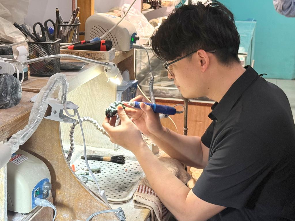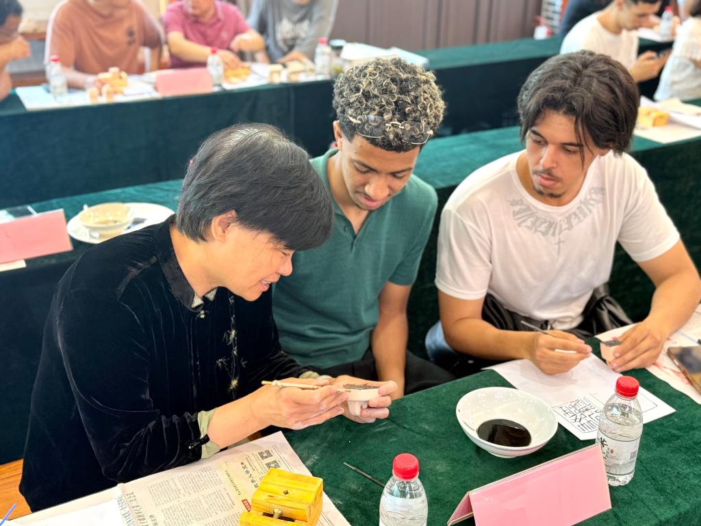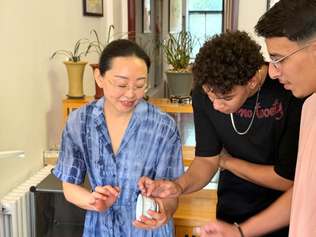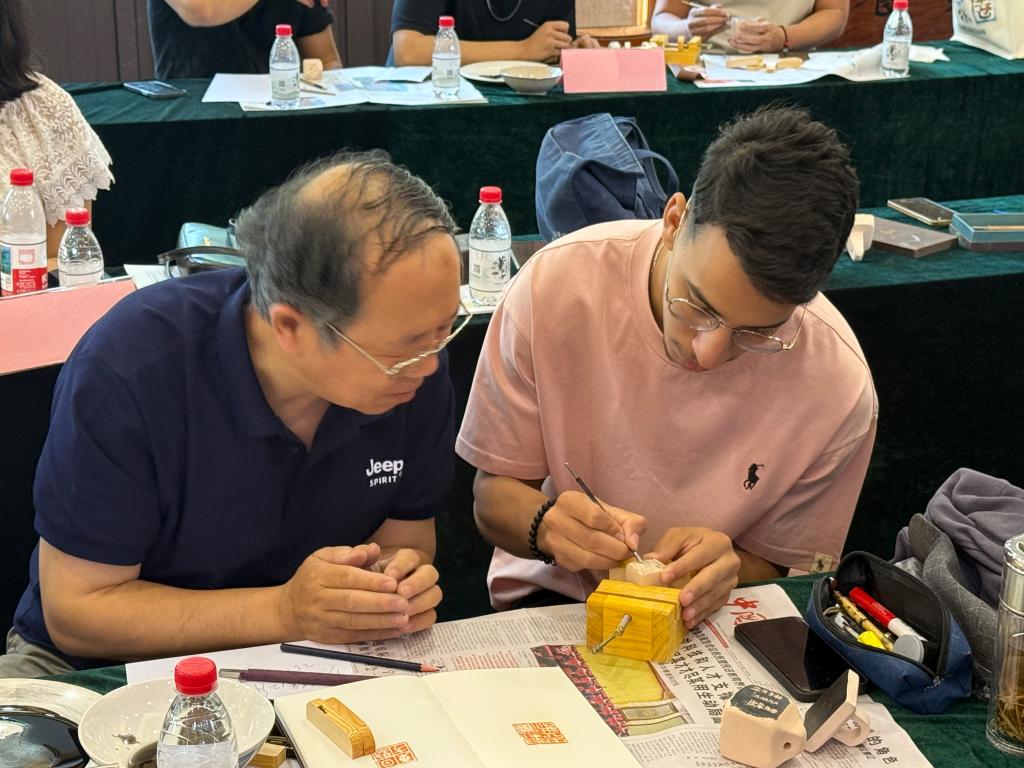 随后的体验环节,留学生们走进弘道堂,亲身参与山东省级非遗项目——陶瓷印章制作技艺。篆刻老师们现场分组指导留学生制作个人印章。通过自己动手雕刻,每位留学生都完成了属于自己的陶瓷印章,切实感受到“方寸之间见天地”的中国传统艺术之美。
